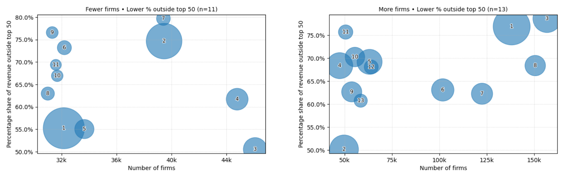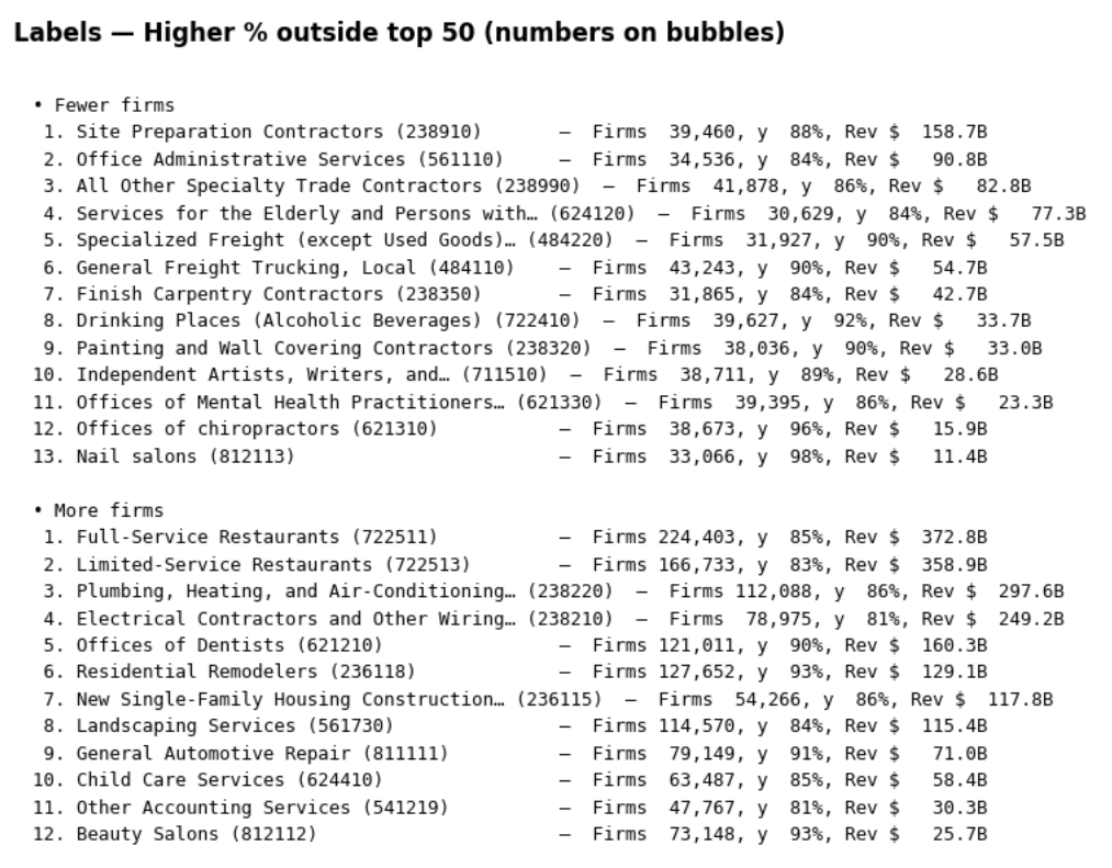 To make the data easier to visualize and highlight the markets with the most firms and the highest fragmentation, we used two (somewhat arbitrary) filters. We show only those 6-digit sectors that have: